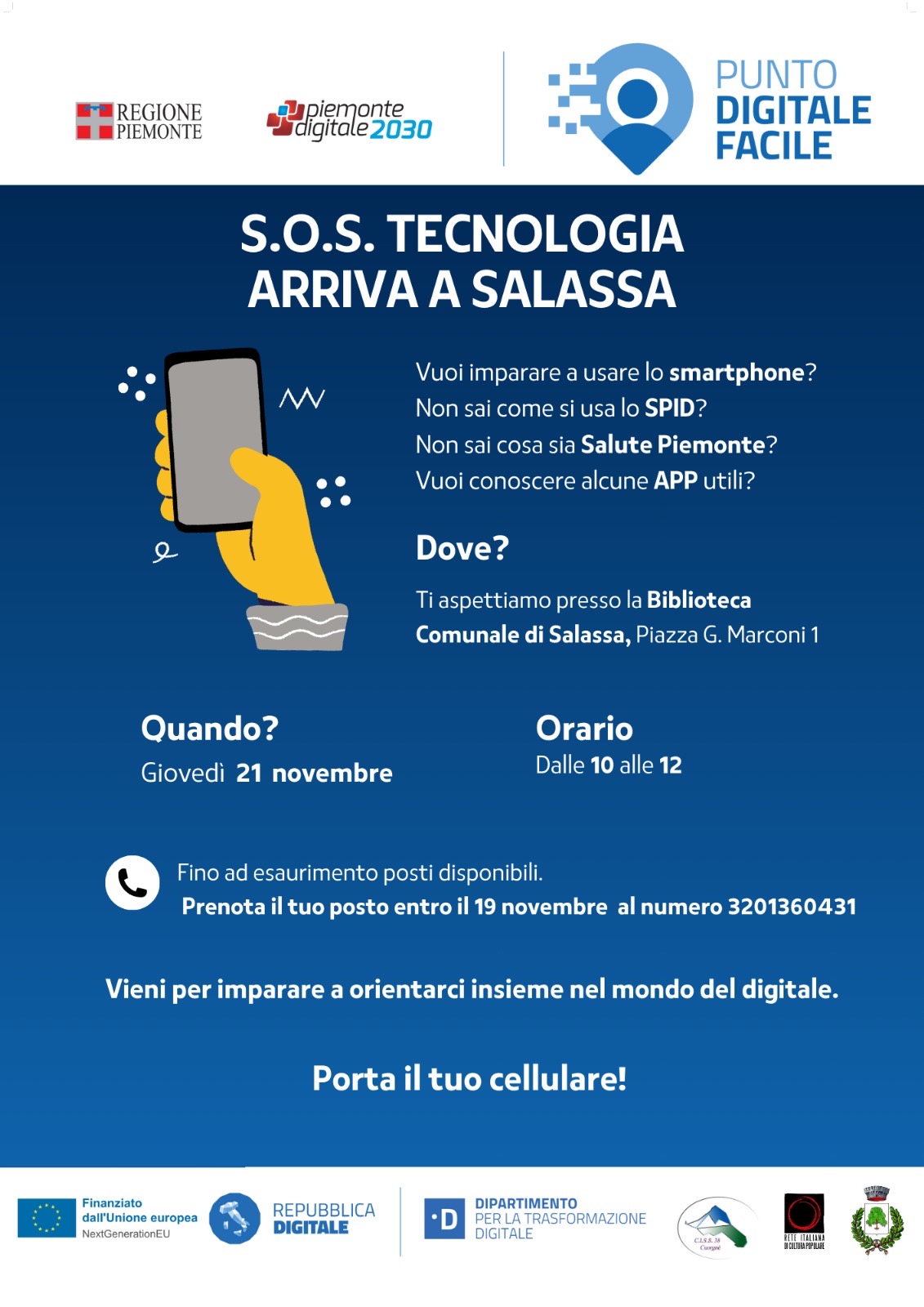 Il progetto Facilitazione digitale è attuato dalla Regione Piemonte attraverso il consorzio CISS 38, promosso dal Dipartimento per la trasformazione digitale Misura PNRR “Rete dei punti di facilitazione digitale”, dedicato ad accrescere le competenze digitali dei cittadini.